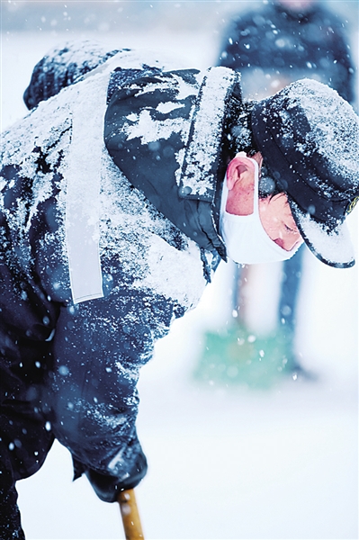 2月14日,内蒙古锡林浩特,铁路职工在风雪中坚守岗位,保运输畅通。唐哲摄/光明图片