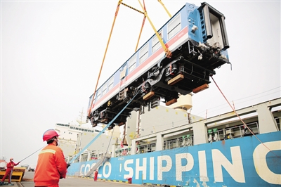 3月3日,中车四方股份公司出口斯里兰卡的内燃动车组在山东青岛港装船发运。张进刚摄/光明图片