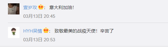 而在地球的另一端,中国网友也在社交网络上纷纷点赞评论,向医护人员致敬!”“看着让人心疼,感谢你们!”“祝愿意大利早日战胜病毒!”