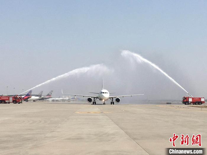 西安机场举行“过水门”仪式为医护人员们“接风洗尘”。西安机场供图