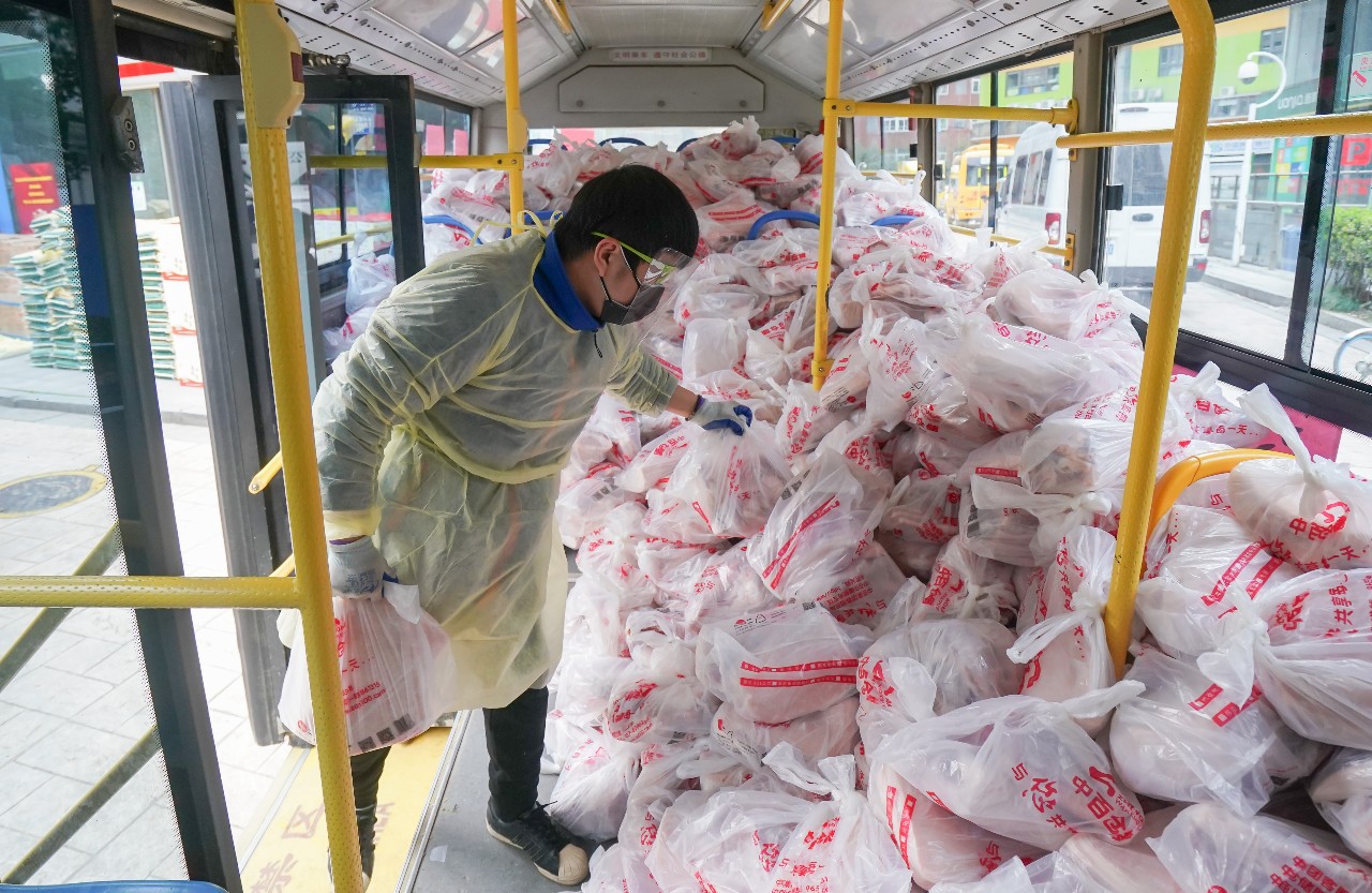 武汉中百仓储的工作人员把准备好的货品装上用来运送的公交车。新华社记者 程敏 摄