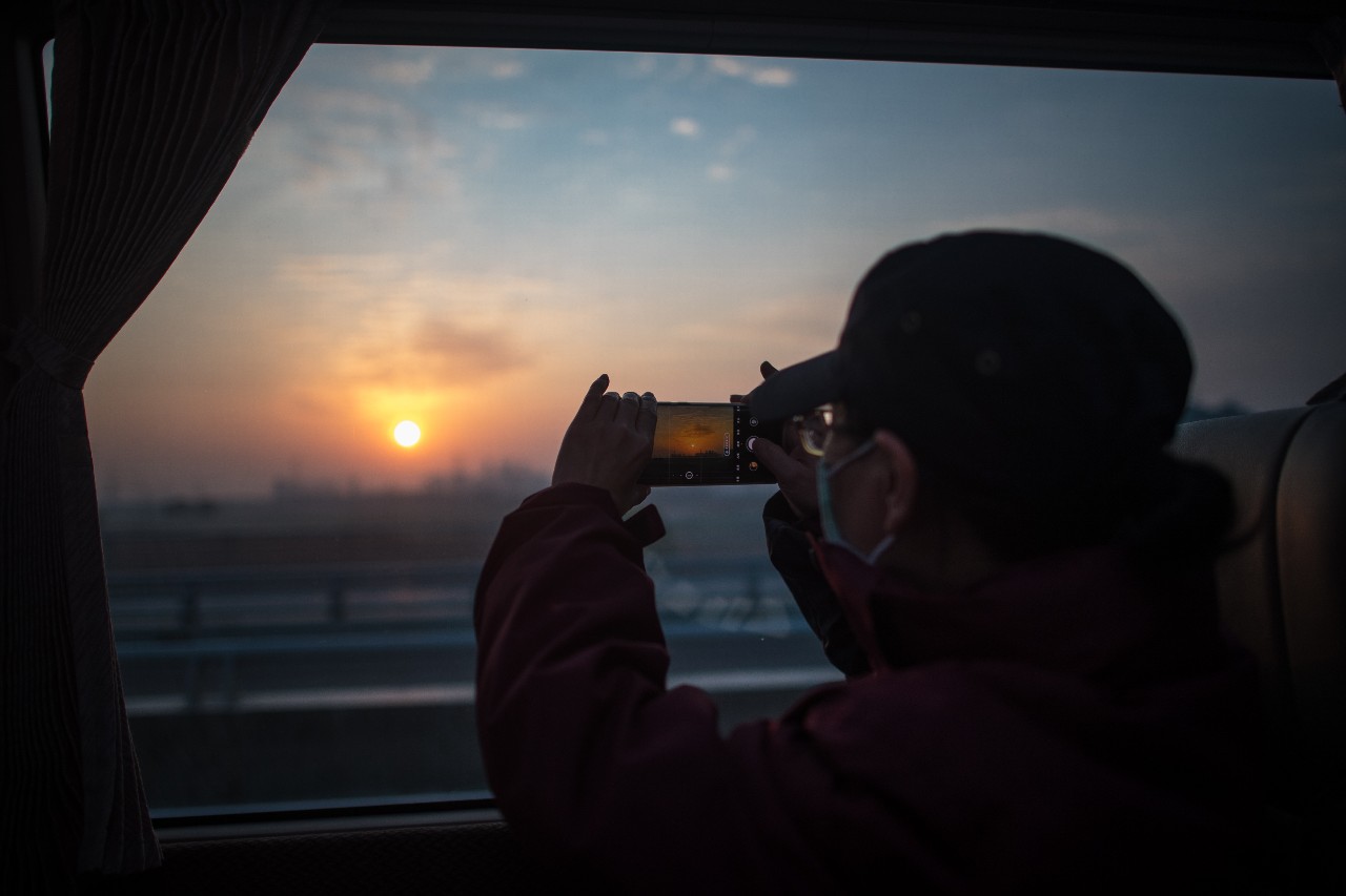 3月17日,陕西国家紧急医学救援队队员在回程的车上拍摄武汉的日出。 新华社记者肖艺九摄