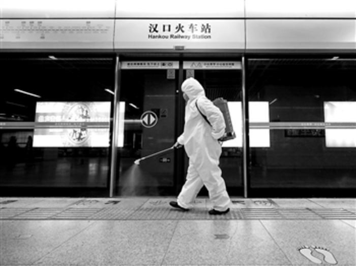 3月23日,保洁人员为汉口火车站地铁站消毒,为恢复运营做准备。新华社记者 沈伯韩 摄