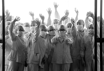 3月23日,武汉市第一医院一些医护人员在武汉天河机场为广东第14批援鄂医疗队送行。新华社记者 陈晔华 摄