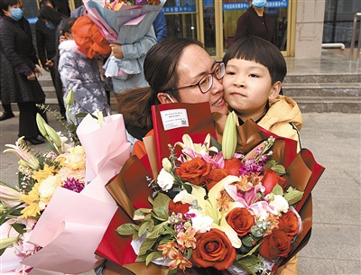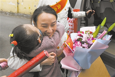 与同事拥抱,与家人相拥而泣,许正萍的母亲张生芳,紧紧抱住许正萍说“回来就好”,看到一旁的女儿,许正萍抱着女儿,在女儿胖嘟嘟的小脸上狠狠亲了几口,都来不及摘下口罩。