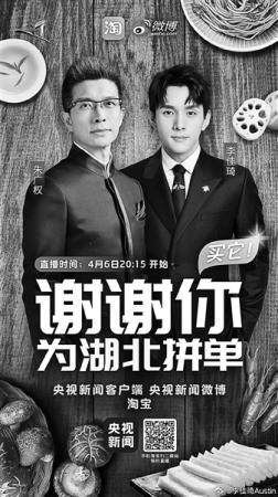 4月6日,央视主持人“段子手”朱广权与“带货一哥”李佳琦组成的“小朱配琦”组合,隔空连线,同框直播,为湖北助力在线卖货。