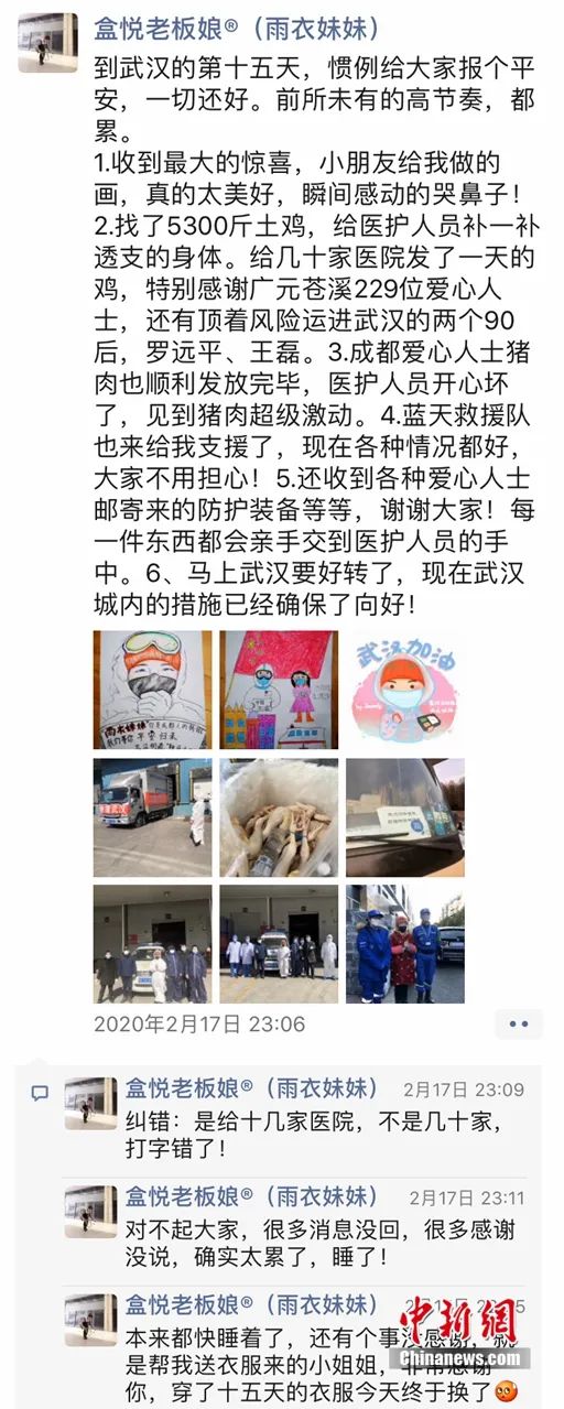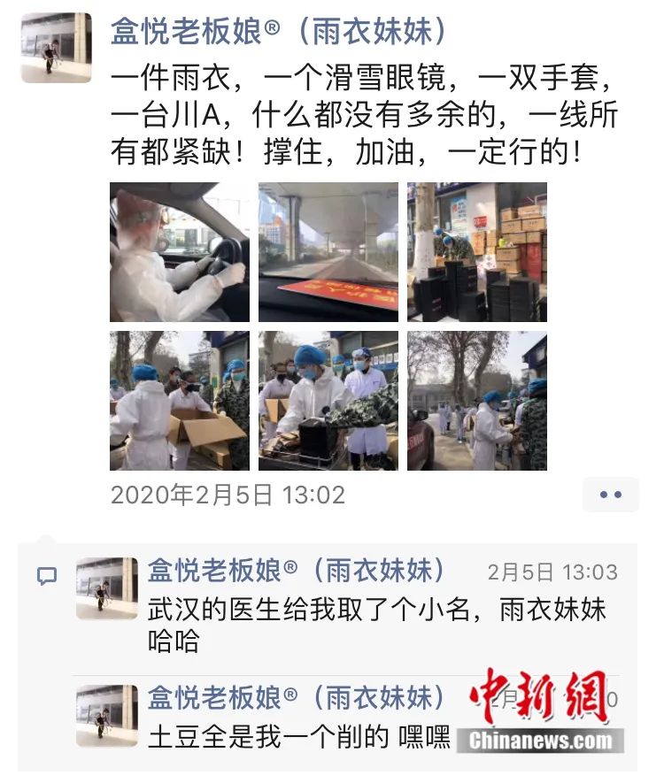 新冠肺炎疫情发生后,武汉情况危急,一线医护人员连轴转,常常不能好好吃上一顿饭。在这样的情况下,“雨衣妹妹”自筹食材,带着团队从成都奔向了武汉。在40余天的时间里,为武汉当地各家医院送上了2万余份盒饭,用这样的方式默默支援一线医护人员。