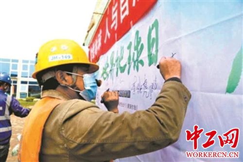 在第51个世界地球日到来之际,中建三局二公司北京公司太原潇河大桥项目管理人员携手30余名工友,践行“水滴计划”中的“每日环保”理念,开展“珍爱地球,人与自然和谐共生”宣传活动。图为工友在环保签名板前签名。张领 摄