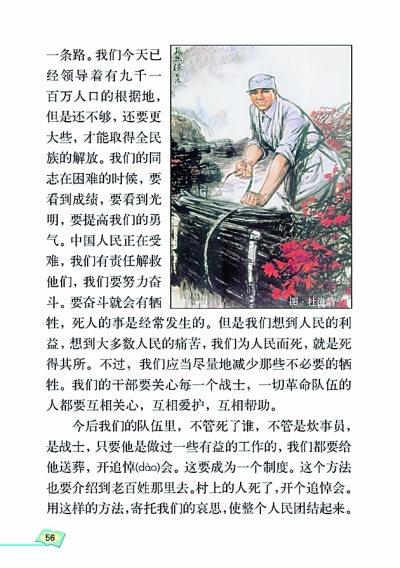 有为人民服务的赤诚。“张思德同志是为人民利益而死的,他的死是比泰山还要重的。”(《为人民服务》,人教版六年级语文下册)“叶欣像一台永不疲倦的机器全速运转着,把一个又一个患者从死神手中夺了回来。”(《永远的白衣战士》,苏教版四年级语文下册)从革命战士张思德到抗击非典的护士长叶欣,他们将个人生死置之度外,赤诚为民、向险而行,他们的名字与精神永垂不朽。