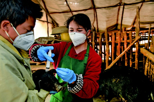 周红珍(右)由哥哥周红山配合,给猪崽打疫苗(4月27日摄)。