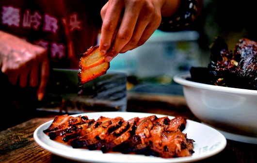 周红珍用蒸熟的腊肉招待慕名而来的客人(4月27日摄)。