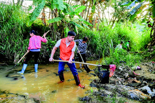 31岁的广西兴业县小平山镇金华村驻村第一书记董积有(左二)与村民一起清理河道淤泥和垃圾(5月2日摄)。在八桂大地,一大批青年党员奋战在扶贫一线,不忘初心、牢记使命,勇于担当、甘于奉献,青春之花在脱贫攻坚的战场上精彩绽放。 新华社记者曹祎铭摄
