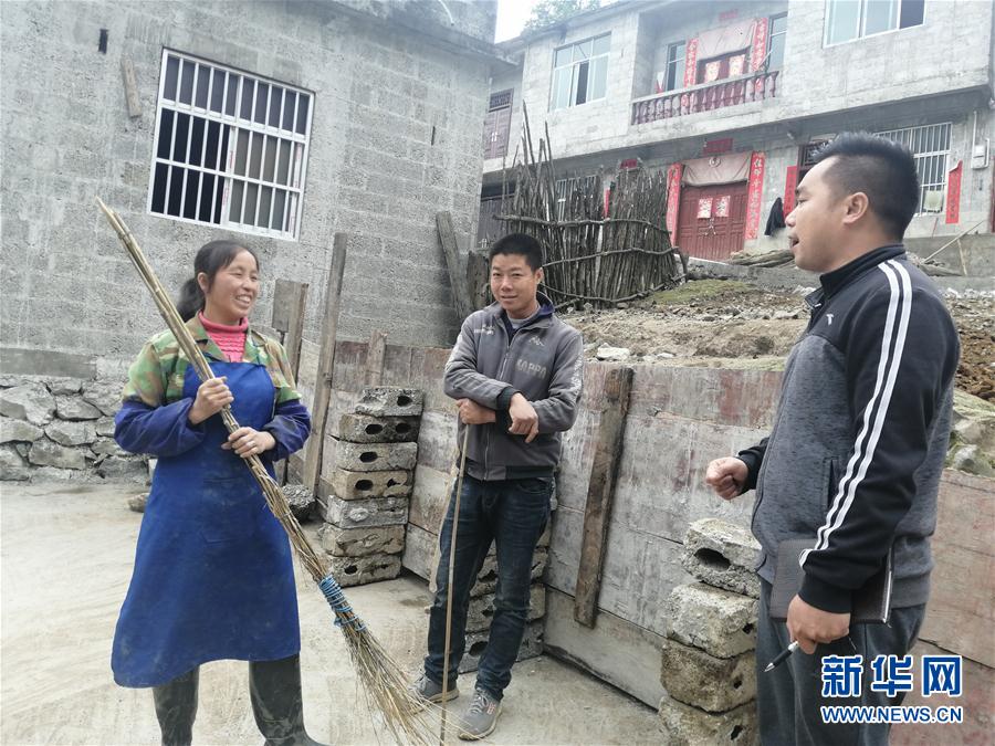 广西乐业县幼平乡通曹村驻村第一书记周昌都(右一)向村民了解厕所修建情况(4月23日摄)。 新华社记者 王军伟 摄
