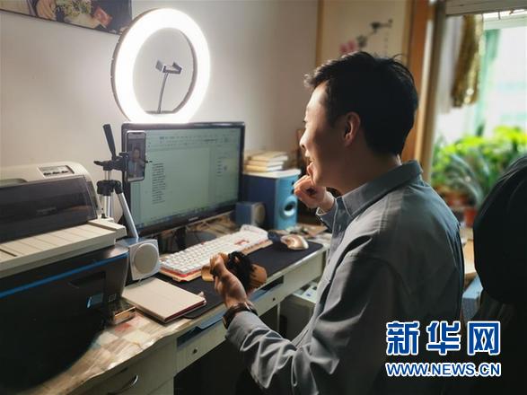 王名乐在家中录制莲花落作品(4月27日摄)。新华社记者 马晓媛 摄