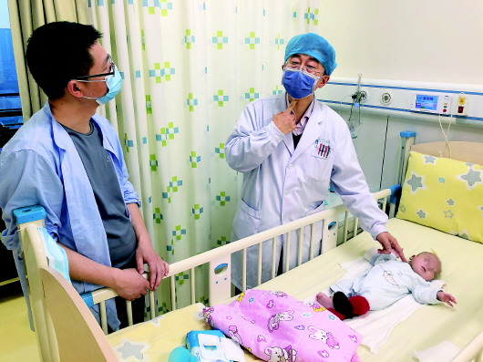 3月26日,沈卫民和晏义威沟通晏小宝的病情和术后恢复情况。(南京市儿童医院供图)