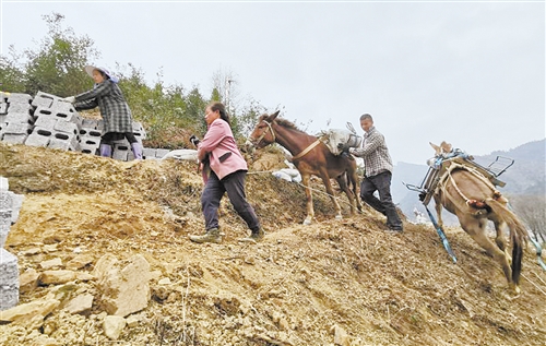 浪平马帮将建筑原材料从山脚驮至建筑地点。(资料照片)