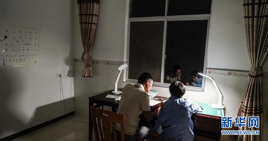 周末夜晚,李菊平在家中和女儿一起探讨习题,左边墙壁上张贴着李菊平自制的英语音标图(6月14日摄)。新华社记者 胡晨欢 摄