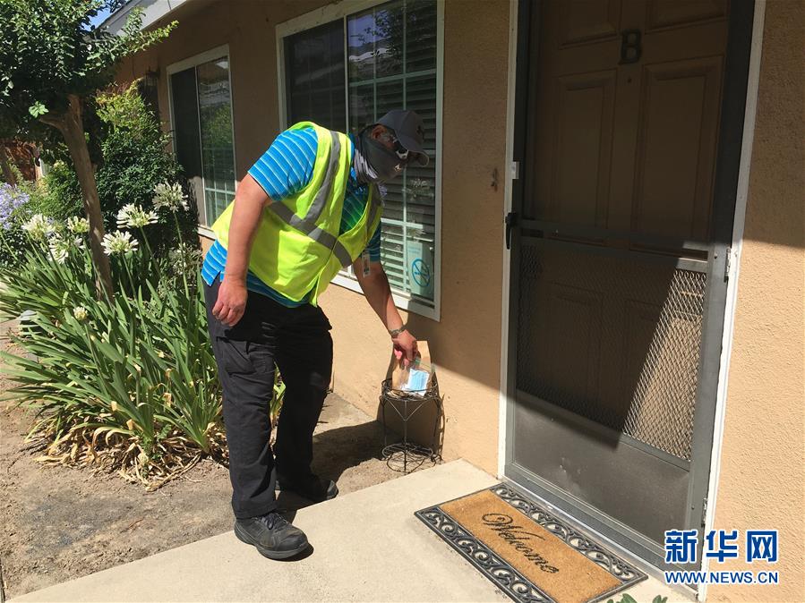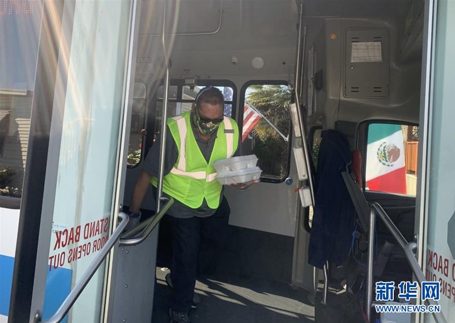 一名美国加利福尼亚州弗雷斯诺县农村交通局的公交司机为当地居民送去食品(2020年6月中旬摄)。新华社发(弗雷斯诺县农村交通局供图)