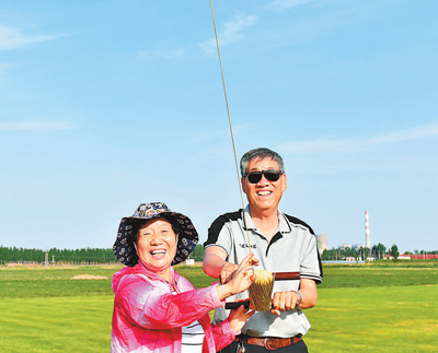 赵鸿斌夫妇在放风筝。人民日报记者 毕京津 摄