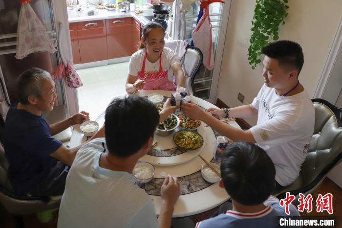 家人在午饭上为岳阳(右一)打气加油。 岳旺 摄