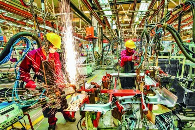 技术工人在山东省青州市一家汽车制造企业的冲焊车间内生产作业。新华社发
