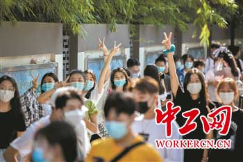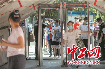 7月7日上午7时,距离高考还有两个小时,地处北京丰台区的北京市第十八中学(以下简称“十八中”)高考考点门前已有考生到达。时值盛夏,清晨刺眼的阳光已经让人睁不开眼,树荫下、墙角边……早到的考生拿出笔记本、教辅书等复习资料抓紧最后的时间“临阵磨枪”,心疼孩子的家长则在一旁摇着辅导机构发放的扇子为他们降温。送考的老师则统一身着红色衣服在考生经过的人行道旁为其加油鼓劲。消毒、测温、查证……8时20分刚过,该考点的400多名考生在考务人员的指挥下,排成四列有序进入考场。在4天的时间里,他们将全程佩戴口罩通过手中的答卷完成这次特殊的“成人礼”。