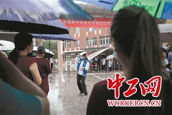 7月9日,思想政治考试科目结束后,一名走出考场的考生在雨中寻找家长。