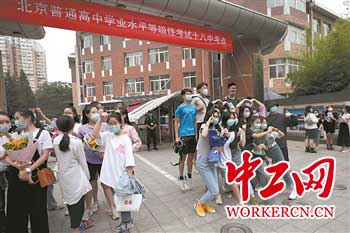 7月10日下午17时,随着地理考试结束铃声的响起,为期4天的2020年北京新高考落下帷幕。十八中考场外,焦急等待的家长终于松了一口气,“终于考完了”。在考点外等候的老师也为考生们送上了一份特殊的毕业礼物——印有各自名字的印章。“希望这半年的经历能够变成他们未来的财富。”看着考生远去的背影,甄兆敏说。