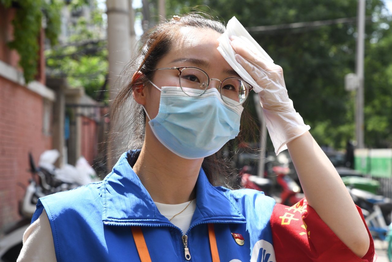 6月16日,在北京市海淀区中关村街道白塔庵社区出入口,疫情防控志愿者在擦拭汗水。新华社记者 任超 摄