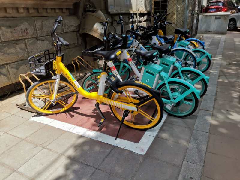 街道上胡乱摆放的共享单车被志愿者摆好。