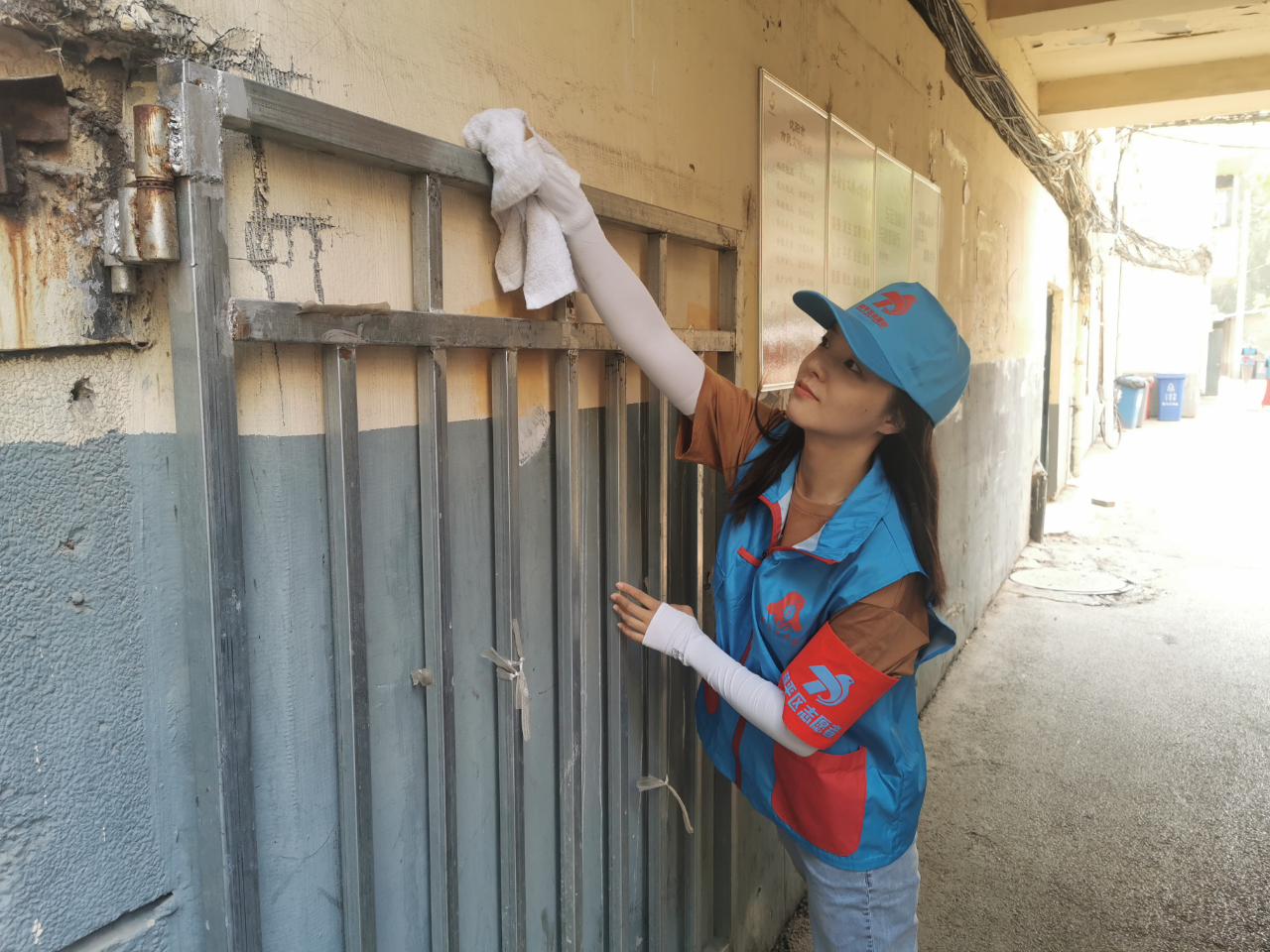 浑然不觉的钟婧珊和同伴一路走一路干着活:半蹲着用抹布一寸一寸擦拭路边的雕塑,弯腰捡起地上的烟头和包装袋送进垃圾桶,把占道停放的单车和助力车摆放归位……看到当惯白领的女儿被自行车脚蹬、后轮蹭脏了裤腿,钟妈妈终于忍不住“现身”,还特别骄傲地和大家合影,“我妈说,志愿者走过的地方,像施了魔法一样干净整洁”。