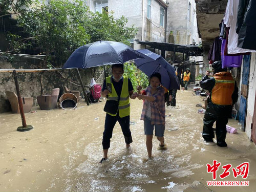 洪水漫延至恩施市烟草公司宿舍区。当地党员干部挨家挨户上门,向居民告知转移事项。许多老人年事已高,行动不便,民兵和党员干部便一一将老人们背出。