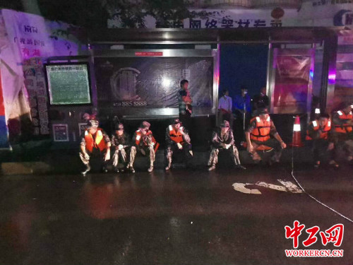 19日凌晨,清扫结束。微弱车灯下,大家已经全身湿透,分不清是雨水还是汗水。