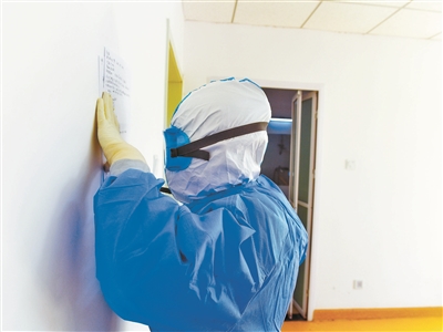 3月4日中午,丰台区中西医结合医院隔离病房,北京青年报记者蒋若静跟随丰台区疾控中心流调员前往现场做流行病学调查。图为记者正在记录流调内容