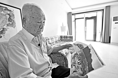 李荣华在家中翻看密云水库建设时的老照片,60年前,他是《密云水库报》的编辑。