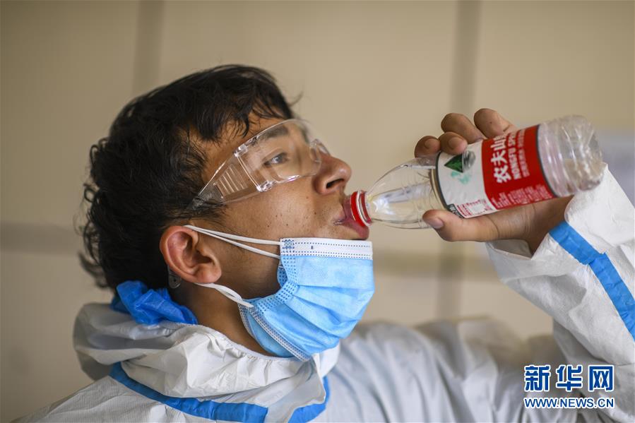 8月3日,在乌鲁木齐市天山区二道弯路25号院内,大学生志愿者艾科拜尔在喝水。 新华社记者 赵戈 摄