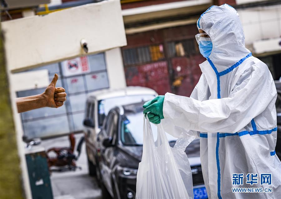 8月3日,在乌鲁木齐市天山区二道弯路25号院内,一名居家生活的住户向大学生志愿者艾科拜尔竖起大拇指。 新华社记者 赵戈 摄