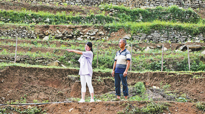 张兴燚(左)与村民商量村中事宜。记者 苏滨摄