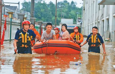 不到10分钟,马军就和同事赶到小区楼下,小心翼翼地将孕妇抬上冲锋艇,向医院转移;由于马达损坏,无法提供动力,医院门口又是个下坡,水深足足有3米,马军和同事索性游泳,用手拽着舟艇向医院前行……