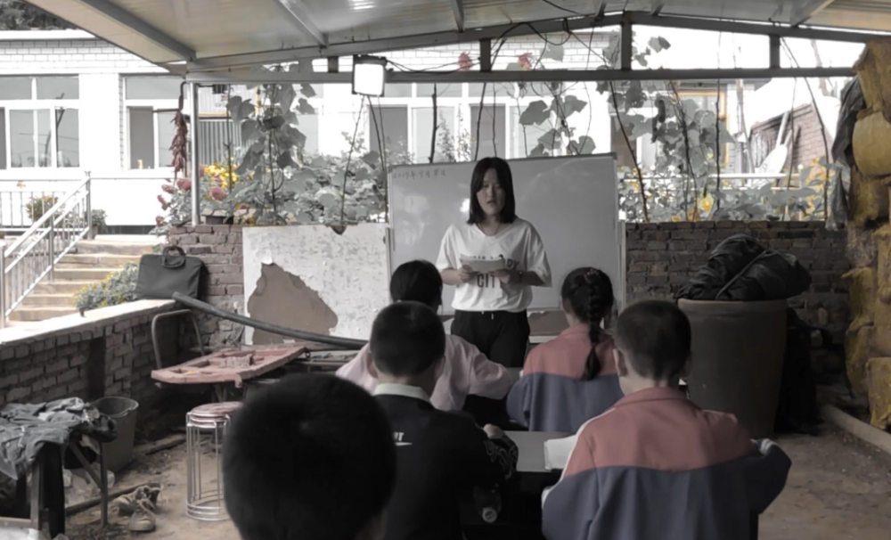整容前的小秋在简易课堂给留守儿童上课。图片为采访对象提供