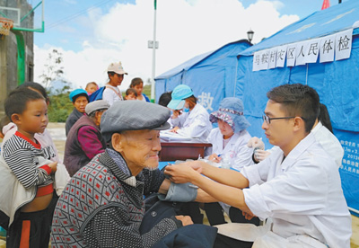 云南巧家县小河镇中心卫生院医生胡兴奎为马鞍村老人测量血压。资料图片