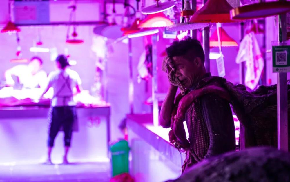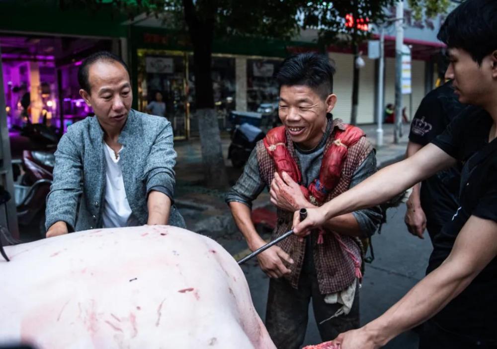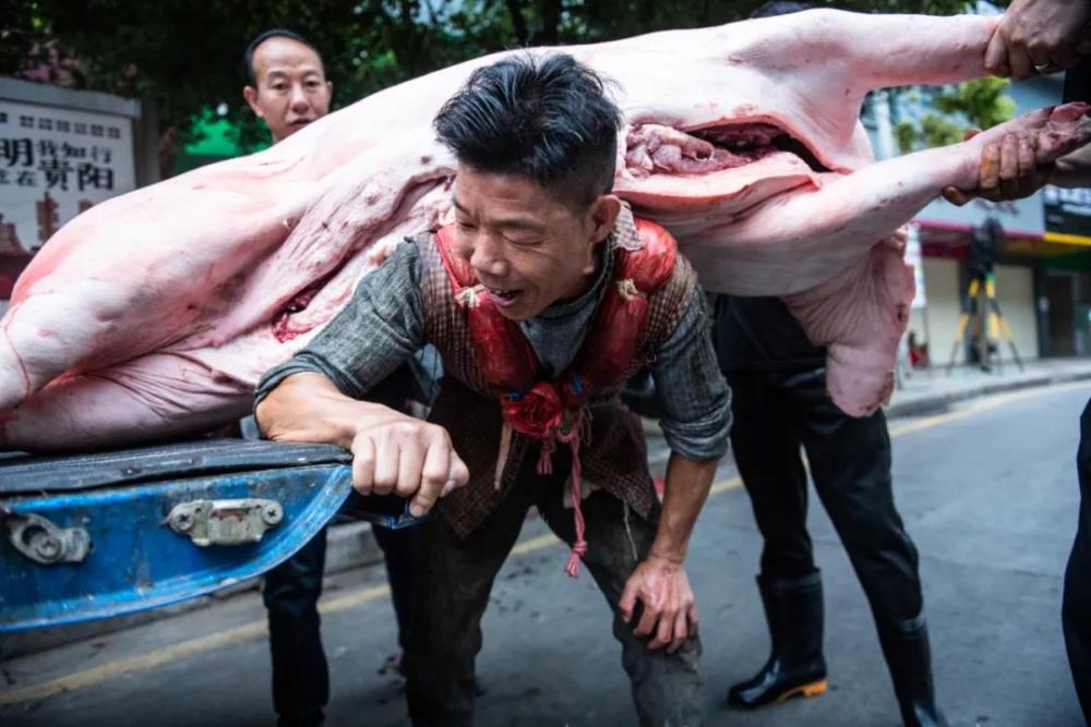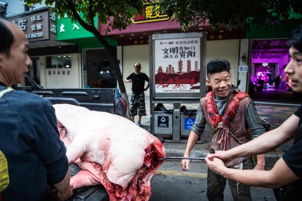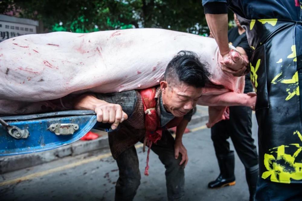 不一会儿,运猪的车到了。朱启伍走上前去,紧贴着车尾单膝撑地,几个人合力将去掉头尾的整猪拖到他的背篼上后,一使劲,他站起来,转身向农贸市场内走去。