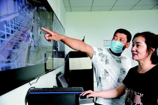 在黑龙江省林甸县众晔牧场,养牛大户吕建华(左)通过监控屏幕查看托养牛的情况(8月19日摄)。新华社记者杨喆摄