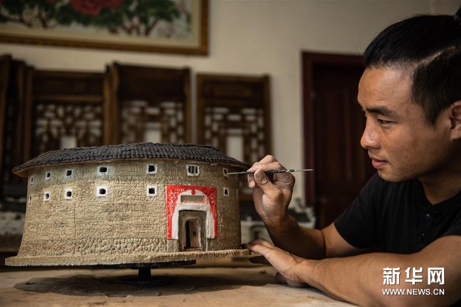 黄简松清理制作好的土陶民居模型(8月28日摄)。今年30岁的黄简松是贵州省安顺市平坝区白云镇平元村一名土陶艺人,毕业于湖南工艺美术职业学院陶瓷艺术设计专业。大学期间去各地采风时,黄简松喜欢观察当地民居,将房屋格局和特点熟记于心。他逐渐萌生出用土陶工艺制作传统民居的想法,开始以老家房子为原型,结合安顺特色屯堡建筑创作土陶民居,并用土陶捏制腊肉、锄头等小物件。2018年,他将自己的作品“土陶民居”制成短视频发布在网络平台,吸引不少网友关注。截至目前,该系列短视频总播放量超过1亿次,许多网友留言说在他的作品中回忆起故乡,找到了童年。黄简松说,希望自己的作品在唤起乡愁的同时,让土陶工艺和中国传统建筑文化得到传承。新华社记者陶亮 摄