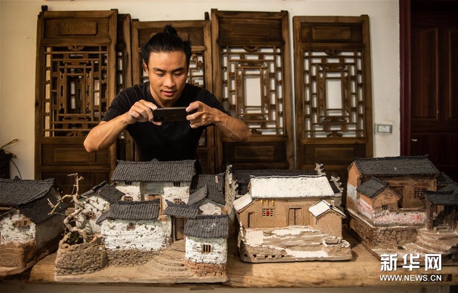 黄简松用手机拍摄制作好的土陶民居模型(8月28日摄)。新华社记者 陶亮 摄
