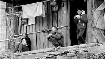 《出山记》一开始,申周(右一)一家在深山中的家门口吃饭。 受访者供图