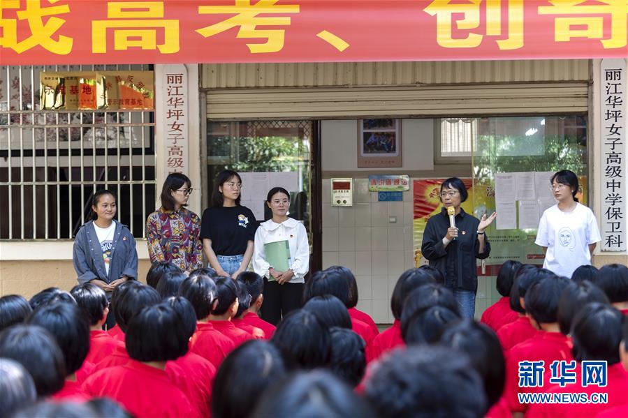 9月5日,云南丽江华坪女子高级中学的校长张桂梅(后右二)在“校课”上为学生介绍新来的四位实习老师。新华社发(陈欣波 摄)