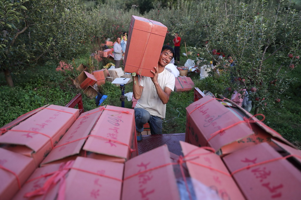 9月9日,在盐源县卫城镇中河村肖宗全的苹果园里,村民在搬运包装后的苹果。