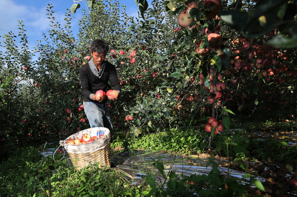 9月9日,在盐源县卫城镇中河村肖宗全的苹果园里,村民在采摘苹果。