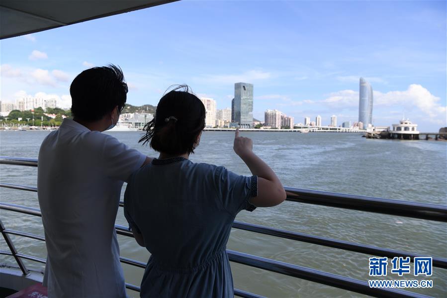 9月18日,陈信彦(左)、杨嘉林在鼓浪屿渡船上眺望。新华社记者姜克红摄